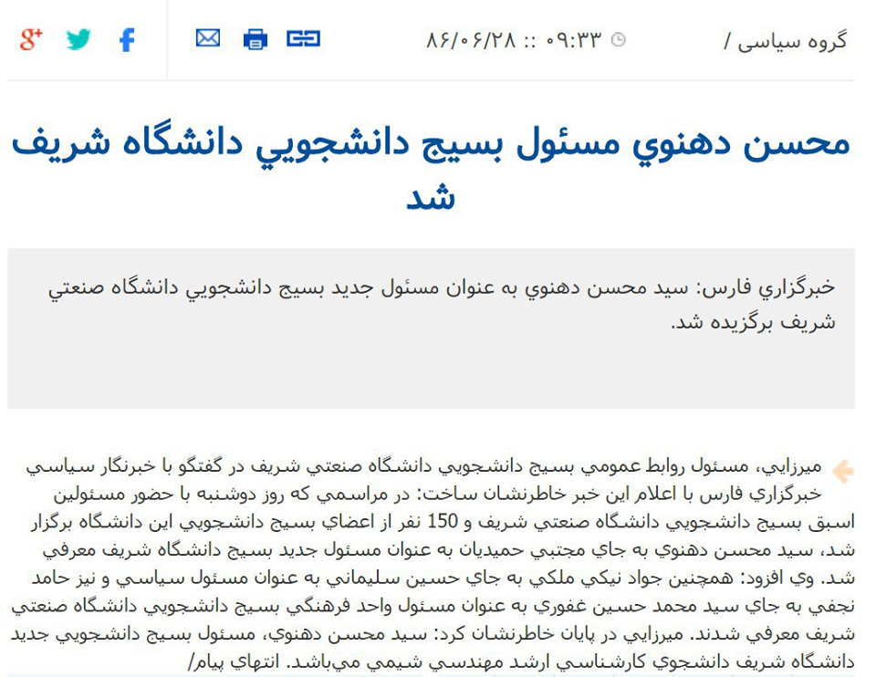 این در حالی است که یافتهها نشان میدهد که «سید محسن دهنوی» از اعضای شناختهشده «بسیج دانشجویی» (بازوی سپاه پاسداران و بسیج در دانشگاهها) بوده و در سال ۱۳۸۶ مسوولیت بسیج دانشجویی دانشگاه صنعتی شریف را بر عهده داشته است.
